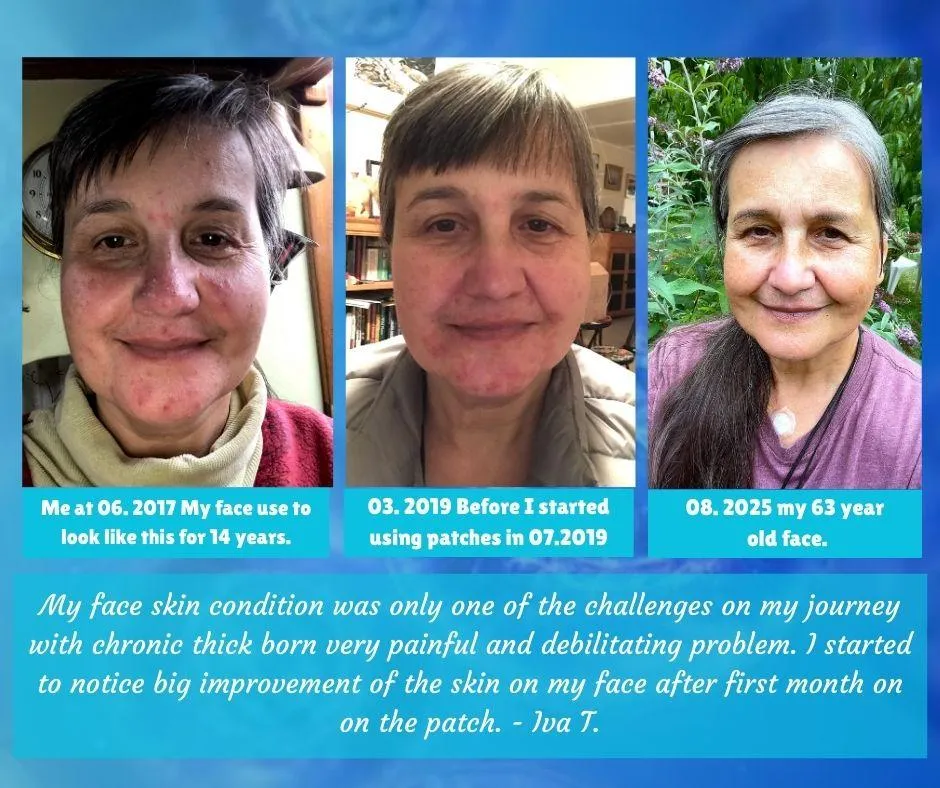 After 3 months using patches, I felt like having new knees, stiffness was completely gone, mobility is nearly back, other chronic pain is much lover or completely gone, challenges of my back, shoulder, hands and other joins, and headaches are gone too. Skin problems I had on my face for 17 years is gone. I feel and sleep great and have energy during the day. I live in hiking paradise, and I can be back on the trails to hike, have garden and work in my ceramic studio, again. I feel so good and living happy life, I never like to be without these patches.